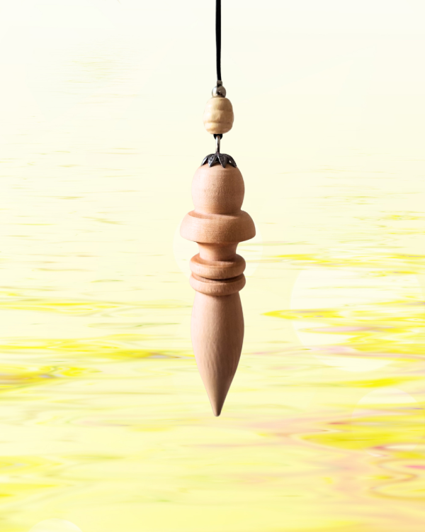 Péndulo egipcio segmentado que irradia verde magnético negativo, la frecuencia universal de equilibrio y purificación. Su forma replica la geometría del templo de Karnak, actuando como antena resonante. Al estar hecho en madera, emite una vibración cálida, suave y neutral, ideal para terapeutas y trabajos sutiles.