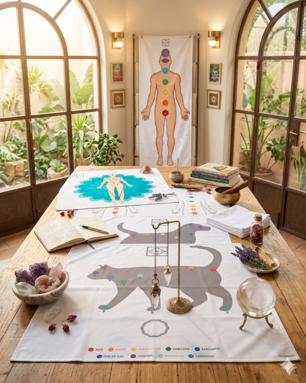 Incluye una manta para perro y otra para gato, ambas con representación de sus chakras (70 cm x 70 cm cada una), para acompañar procesos de sanación en seres que amamos profundamente.