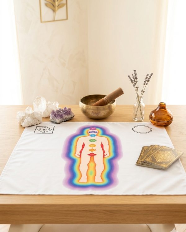 La manta está diseñada con el Pentáculo Cabalístico que protege al terapeuta y un Triple Decágono de curación que acelera el proceso del trabajo.
